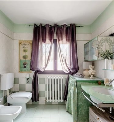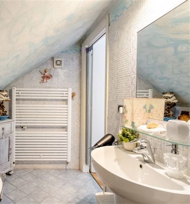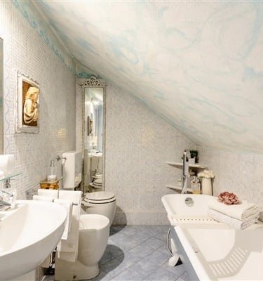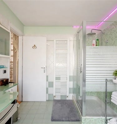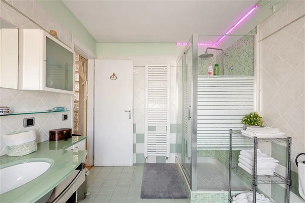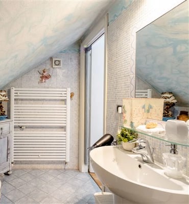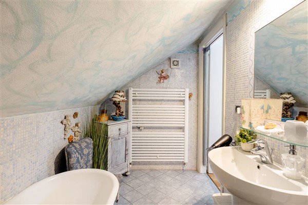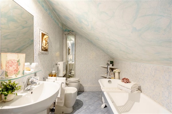 La stanza matrimoniale si trova al piano superiore è dotata di condizionatore e di un grazioso bagno privato, con vasca da bagno di design con piedini. Smart Tv con piattaforma Sky e Netflix
