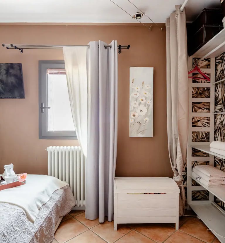 La stanza si trova a al piano terra è dotata di Letto alla francese, guardaroba smart tv e bagno privato esterno con doccia non è dotata di condizionatore ma di un raffrescatore.